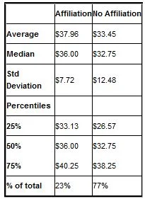 There appears to be relationship between affiliation with a professional organization and rates, but it is unclear exactly what that relationship is. The rates included both direct rates and subcontracting rates according to the percentage of direct work reported. One explanation may be that affiliated writers manage to get a higher percentage of direct work, thus increasing their rates. Another may be that subcontractors and lower paid writers are less likely to pay membership dues.