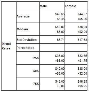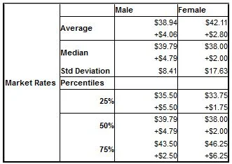 The differences between male and female rates continues to be minor and which earns slighly more changes from quarter to quarter. This indicates that there is little if any sex discrimination in this profession.
