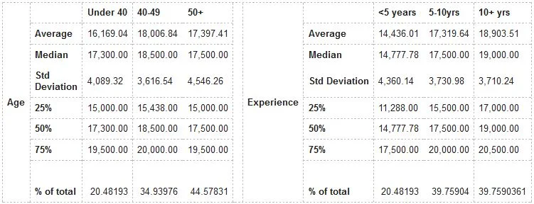 These two categories are displayed together because age discrimination appears to have explained some of the anomolies in the relationship between salaries and experience. The 40-49 age group continues to be the best paid group overall and has again surpassed their older counterparts at the high-end as well. Despite the fact that the salary gap increased slightly between the 40-49 age group and the 50+ group, the 900 NIS increase over the previous 2 quarters shows that a number of hi-tech companies have begun to take notice of older technical writers who were relatively under paid.