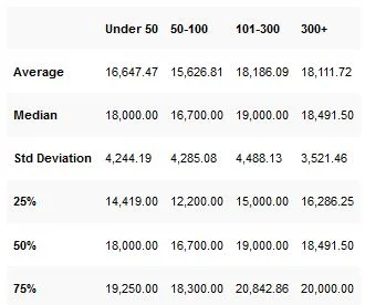 Although the relationship between company size and salary continues for companies of 50+ employees, small companies with under 50 employees have started to seriously compete for writers and are now paying more than companies with 50-100 employees, but it appears that they are "stealing away" employees from the larger companies (101+ employees) while the larger companies appear to be hiring more writers at the lower end.