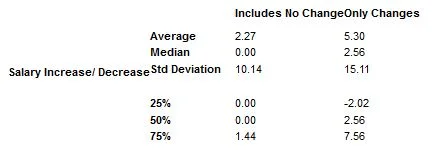 However, of those who reported a change in salary the average raise was 5.3% and the median raise was 2.56% of the previous quarter's adjusted salary. Those in the 25 percentile of change had a decrease in adjusted salary of 2.02%. Those in the 75% of change received an increase of 7.56% over the previous quarter's adjusted salary.