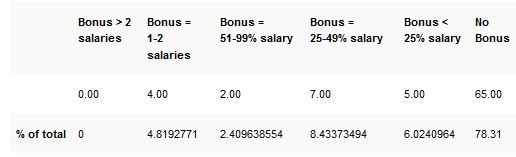Bonus > 2 salariesBonus = 1-2 salariesBonus =