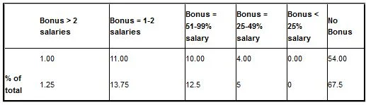 Bonus > 2 salariesBonus = 1-2 salariesBonus =